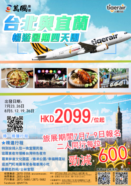 住民宿,逛夜市,吃小吃,台灣與宜蘭暢遊暑期四天團!原價HKD2099/位起,展會現場兩人同行,每位勁減600!優惠價HKD1499/位起。美食旅遊兩不誤!