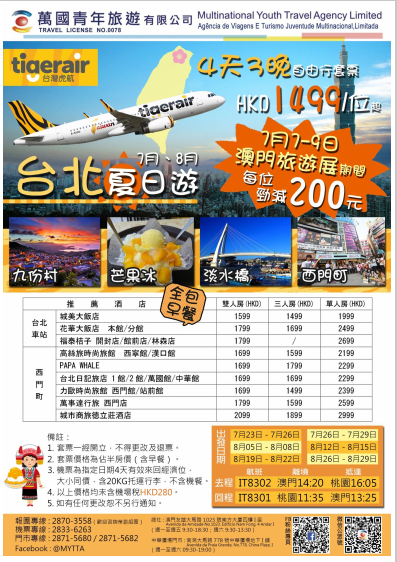 台北夏日遊,虎航4天3晚自由行套票,每位勁減200元!