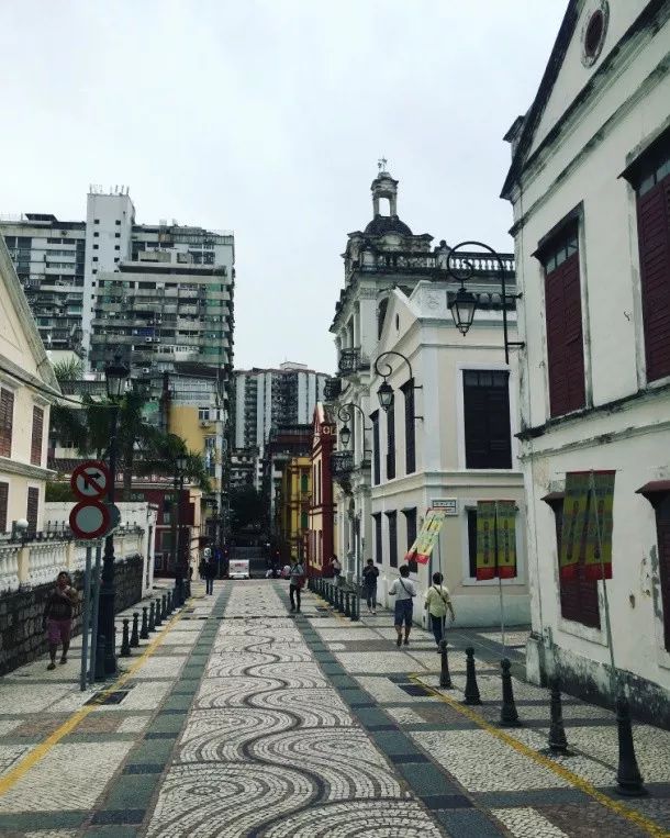 秋日裡的微風透著一些涼意,腳下踩著黑白紅三色碎石路,周圍是色彩明豔的葡式建築,仿佛已經置身在某個歐洲小鎮的角落,一轉身就有一段異國情緣的開始。安靜藏匿在澳門半島繁華鬧市中,這裡有一條洋溢著葡式文藝風情的美麗街道——瘋堂斜巷。