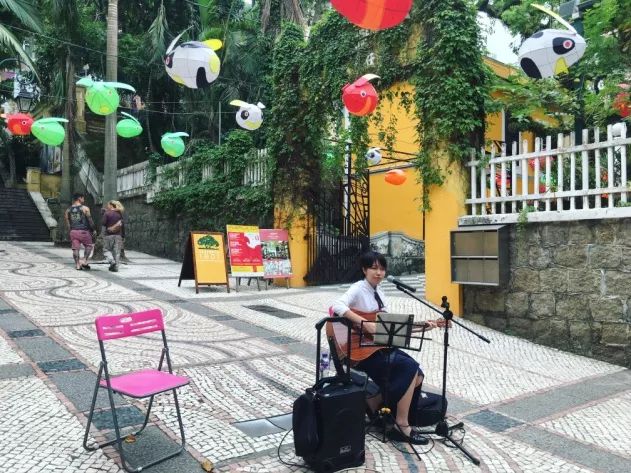站在街頭,眼光馬上被眼前熱情奔放的歐式風情所吸引:街道兩旁矗立著造型經典的葡萄牙建築,黃白相間,色彩鮮豔;鋪著彩色葡式碎石的小路,圖案獨特;每走一小段路就有一盞歐式街燈點綴…..每個細節都展現出滿滿的異國風味。如果幸運的話,還會在街角聽到一場澳門藝人的街頭演出。