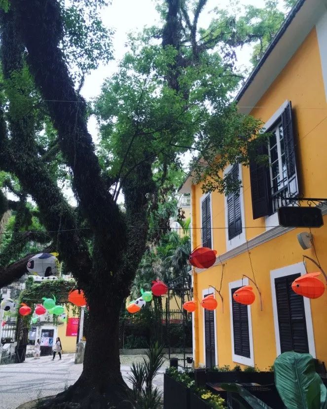 沿著葡式碎石路慢慢前行,右前方有座拱形大門,沿著拱門入內,三座明黃色的葡式建築映入眼簾。這三座葡式建築就是“婆仔屋”。庭院深深,兩棵枝葉繁茂的百年老樟樹被藤蔓纏繞,為這個小院子增加了無限生機,環境清幽。明黃色的建築在綠葉的襯托下,更顯莊重優雅。