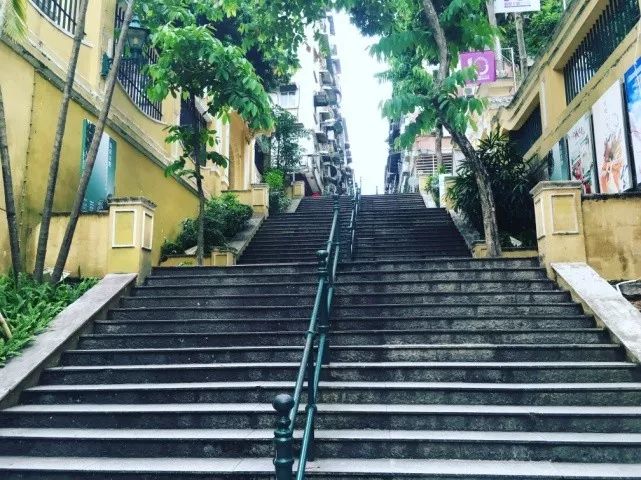 從婆仔屋出來,右手邊是一條長長的樓梯,這裡就是瘋堂斜巷的盡頭了。樓梯上樹木蔥郁,和旁邊明黃色的建築交相輝映,更顯獨特。這條短短不過百餘米的小巷,展現的就是澳門西式文化的那一面,魅力四射。