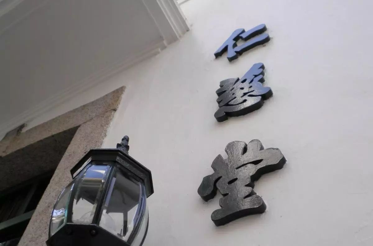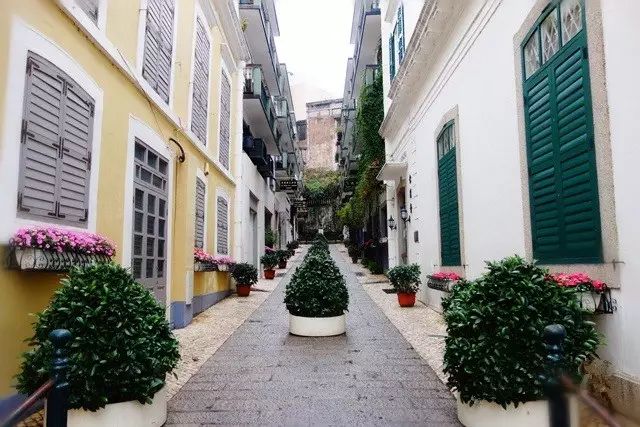 仁慈堂博物館的入口有點隱秘,位於大樓左側的巷子裡。這條僅僅幾十米長的幽靜小巷,兩側建築風格類似,只不過一側是淡黃色牆體灰色木葉窗,另一側是白色牆體墨綠色木葉窗,再加上中間鋪設的盆栽和石板路,襯得極其好看。