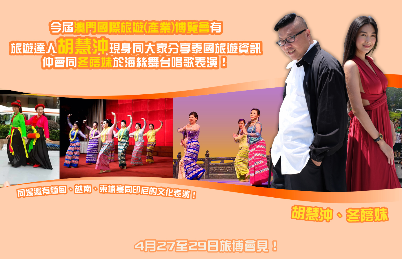 今屆澳門國際旅遊(產業)博覽會有旅遊達人胡慧沖現身同大家分享泰國旅遊資訊,仲會同冬蔭妹於海絲舞台唱歌表演!同場還有緬甸、越南、柬埔寨同印尼的文化表演!